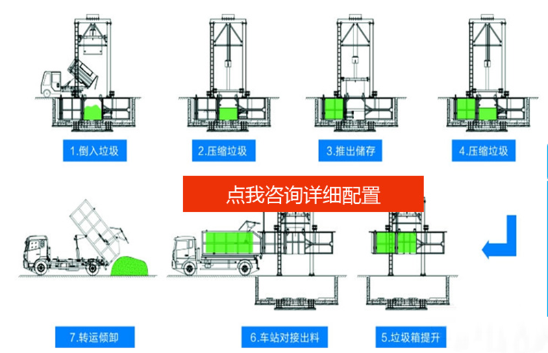 5.設有垃圾儲存箱,適合集裝箱式散裝垃圾運輸車卸料,減少運輸費用。